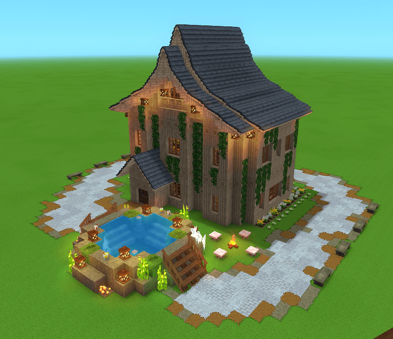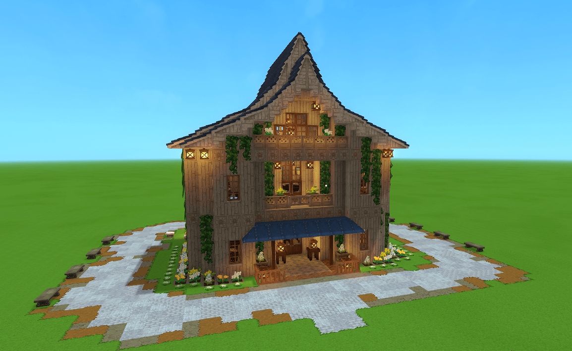 A beautifully done restaurant and spa, complete with dining, a tavern, an outdoor spa, workbenches and storage. Great addition to any village or server.