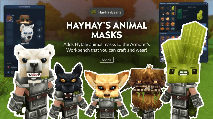 Adds Hytale animal masks to the Armorer's Workbench that you can craft and wear!
