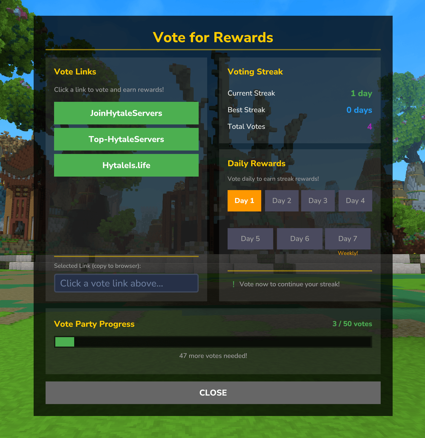 A modern voting plugin for Hytale with V1, V2, and HTTP support. Includes Vote Party, streak rewards, reminders, custom UI menus, and full server-list compatibility.