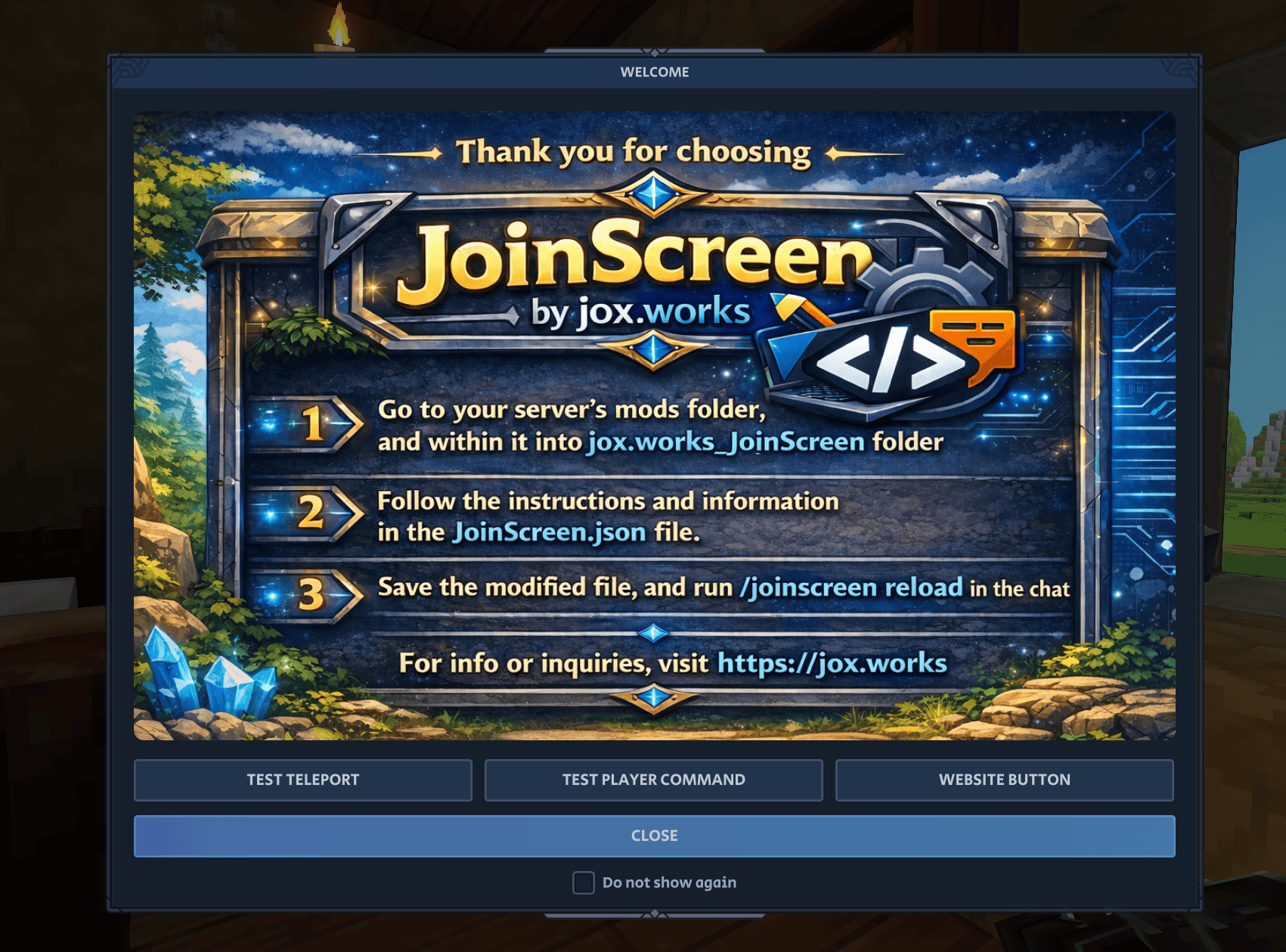 JoinScreen adds a dynamic join popup with a (URL/local) image, text and action buttons when players join your server. Super-easy drop-an-image solution. Show server rules and tips, website link, banner, instructions, etc.