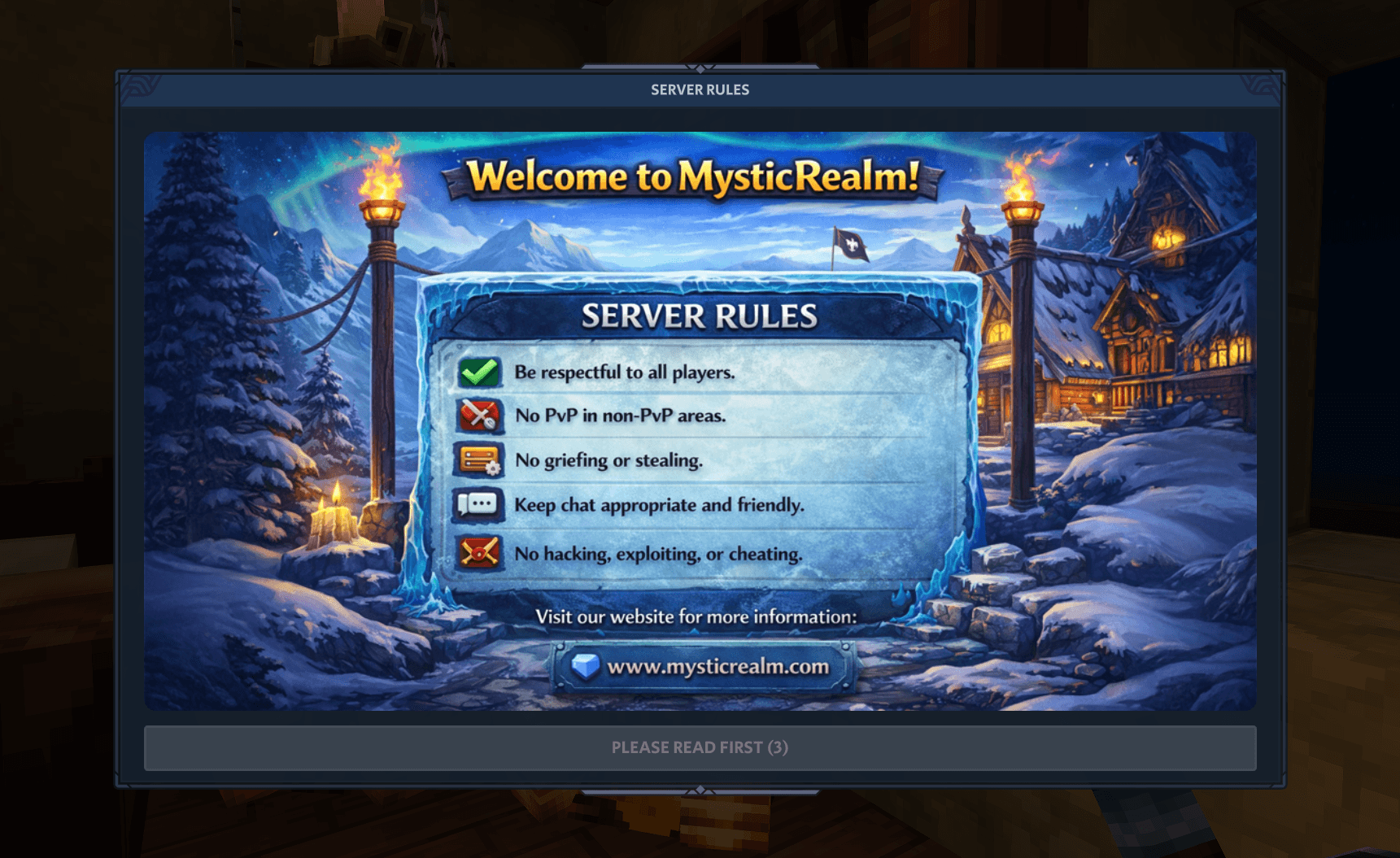 CurseForgeJoinScreen adds a dynamic join popup with a (URL/local) image, text and action buttons when players join your server. Super-easy drop-an-image solution. Show server rules and tips, website link, banner, instructions, etc.