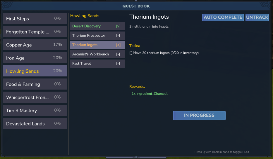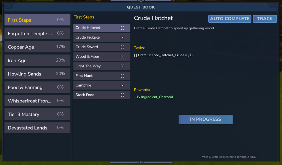 A quest progression system that guides players through structured survival, crafting, exploration, and combat milestones in a cohesive adventure path.