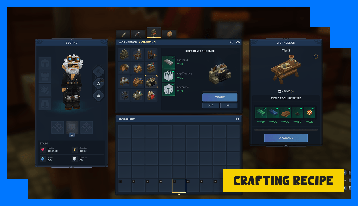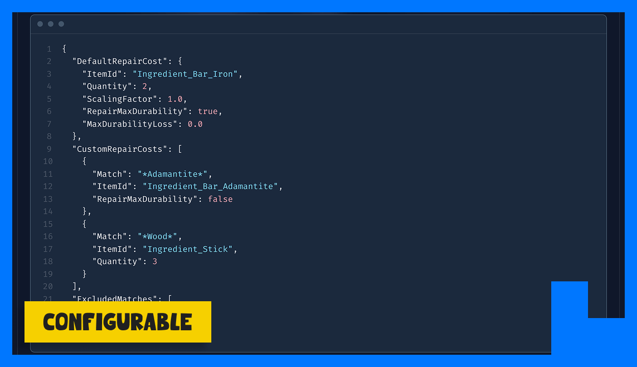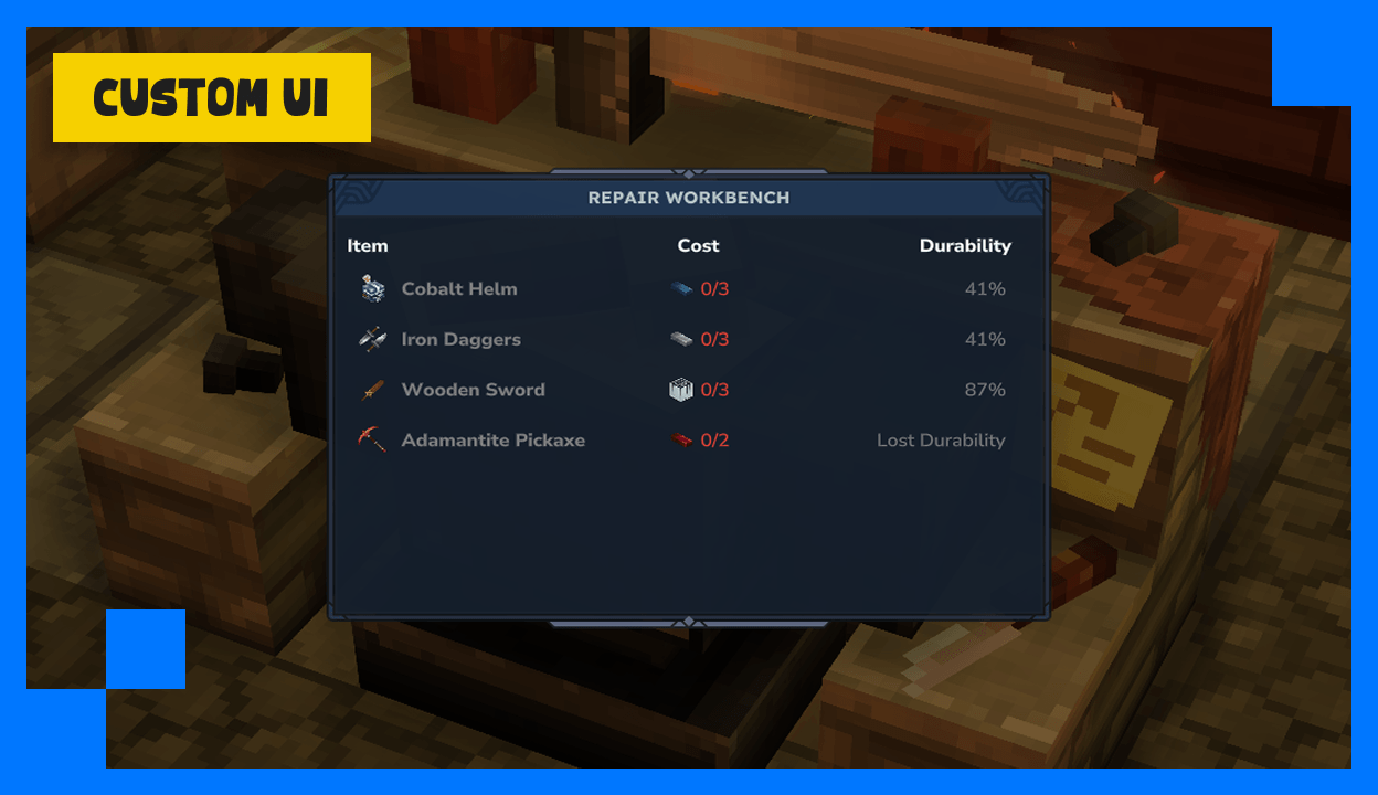 Adds a new workbench that repairs items without durability loss for a small fee