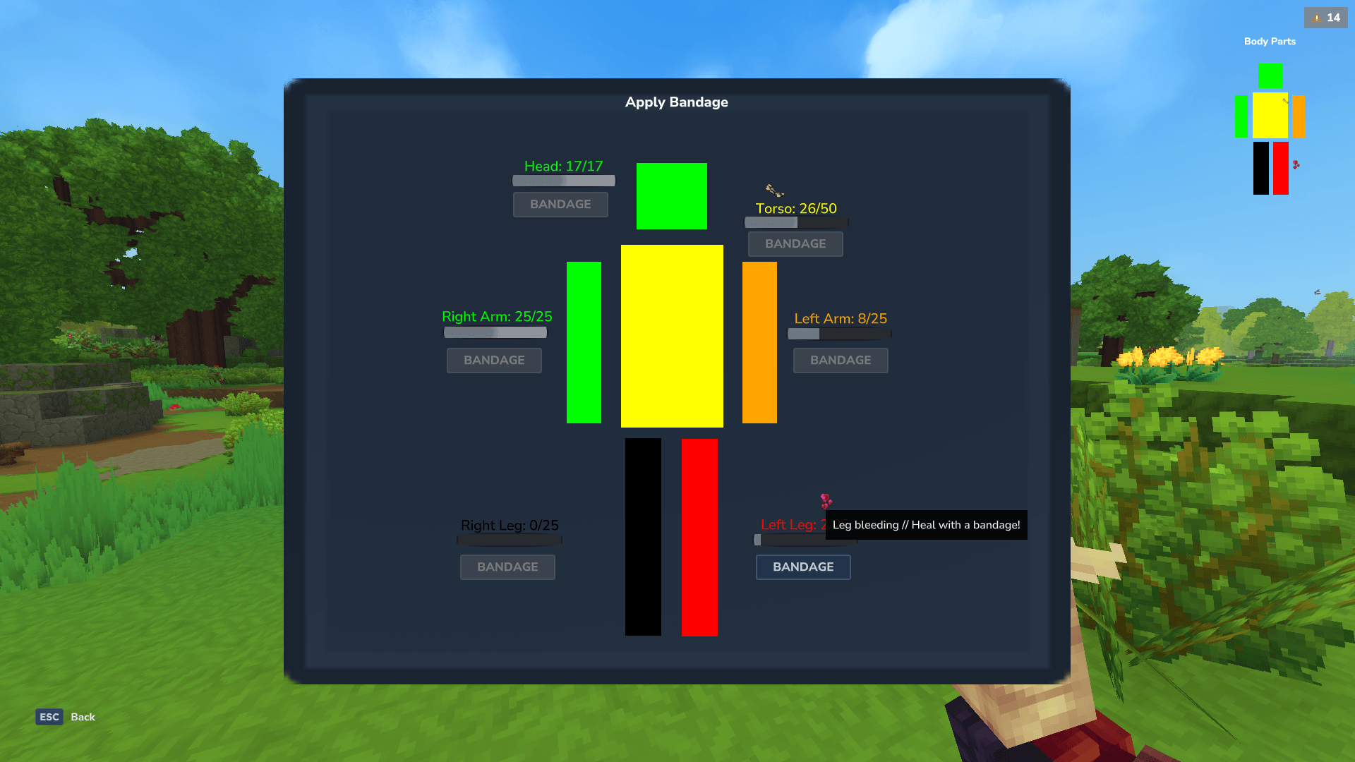 Taking damage has a configurable chance to apply injuries to the specific body part that was hit.